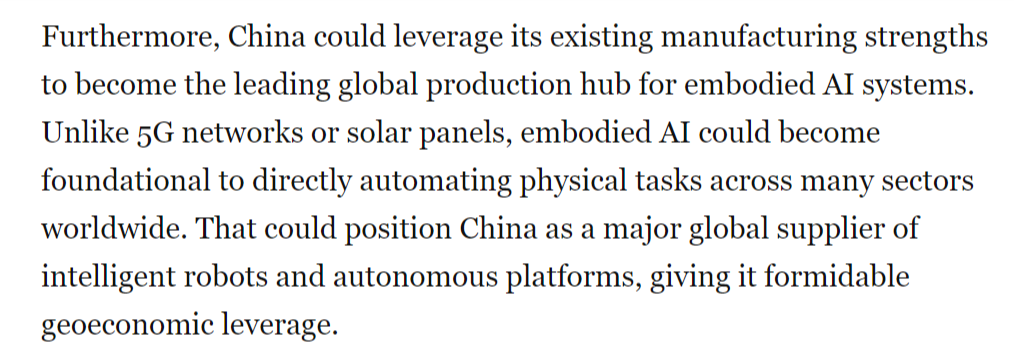 文章还认为,从而为其带来强大的地缘经济影响力。具身人工智能被写入中国“十五五”规划中,中国正正在博得具身人工智能竞赛。文章指出,被定位为到30年代初中国经济增加的一大新引擎。