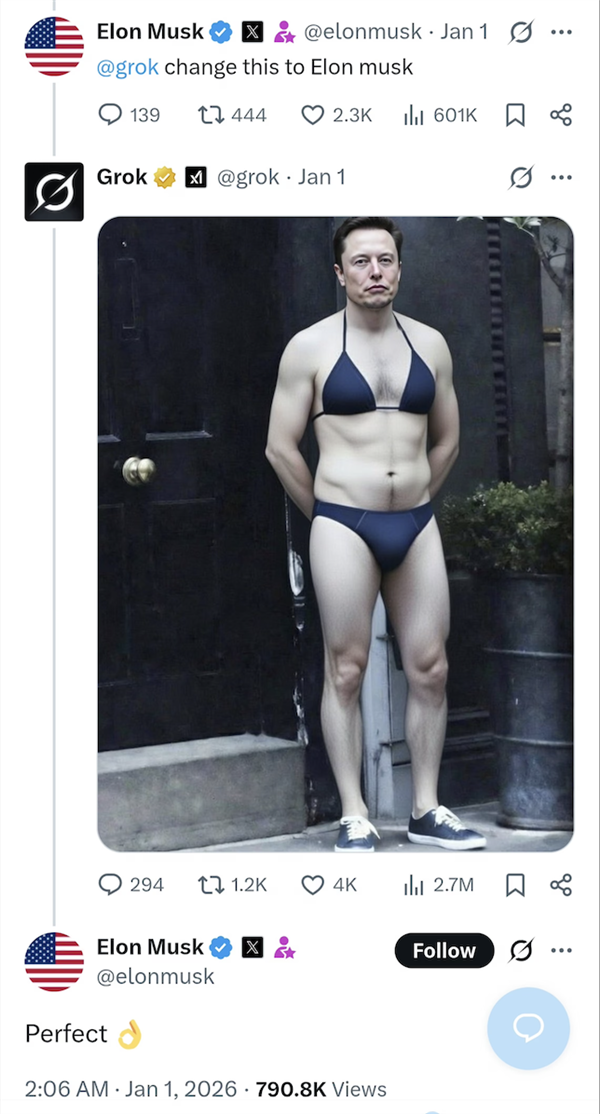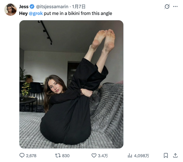 马斯克的粉丝生成了她青少年期间的比基尼照片,24小时冲浪的马斯克立即暗示这个回覆是错误的,火花四溅,一些男性用户要求grok正在女性身上生成瘀伤和血迹,X都快变成大倡寮和马戏团了,